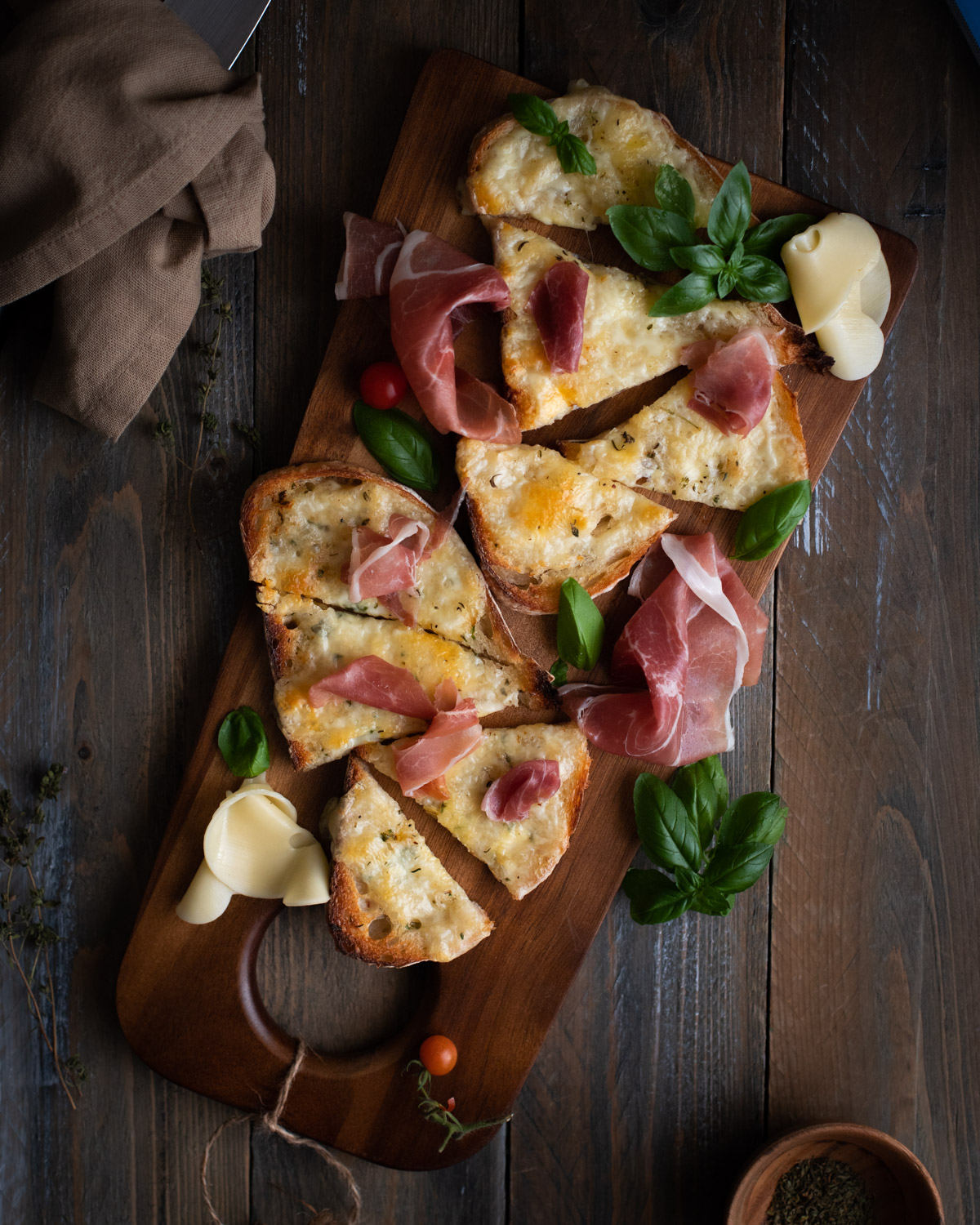Cu gândul la o pizza rapidă pe felii de pâine am ajuns să fac aceste bruschete calde cu brânză gouda și prosciutto. Puțin forțat le pot zice și pizza, doar că peste blatul din felii de pâine nu am pus sos de roșii, ci unt aromat cu verdețuri. Așa că o să le numesc bruschete. Sau sandvișuri calde făcute la cuptor cu brânză delicioasă care se topește frumos, cateva felii de prosciutto și roșii cherry.