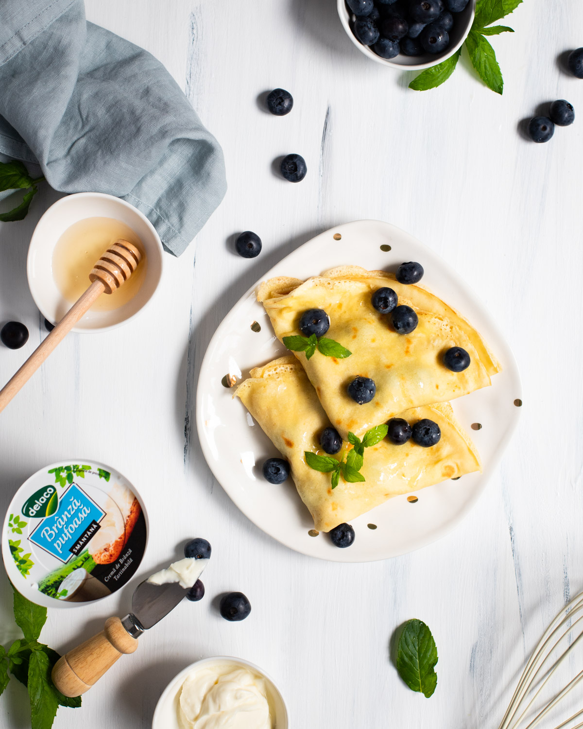 Clasicele clătite pot fi un desert special dacă te joci puțin cu umplutura lor. Înlocuim dulceața sau gemul cu o cremă de brânză dulce făcută cât se poate de ușor din ingrediente simple. Cremă de brânză fină, o linguriță sau două de miere, după gust și câteva fructe proaspete. Astăzi punem afine. Sunt pline de savoare și în această perioadă se găsesc foarte ușor în market sau la piață.