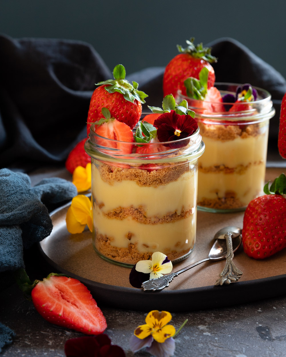 Ingrediente desert: 200 g biscuiți digestivi, cremă vanilie, fructe proaspete, flori comestibile