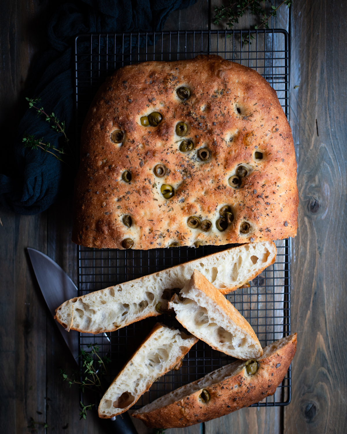 Săptămâna trecută am pus pe “repeat” aceasta focaccia delicioasă făcută cu drojdie. Focaccia fără frământare, cu bule mari de aer, moale și atât de bună încât am mâncat-o și la desert 😜