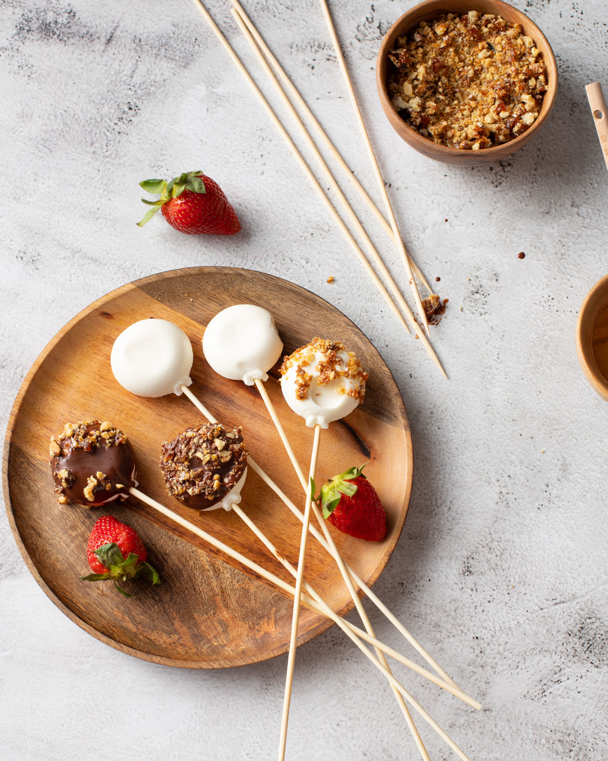 Am topit ciocolata cu un strop de ulei de cocos și am pus-o într-un castron. Pe lângă asta am vrut să fac și ceva crocant și dulce și așa mi-a venit ideea să caramelizez nucile, iar apoi să le zdrobesc. Dar merg la fel de bine nuci sau alune prăjite foarte puțin în cuptor sau în tigaie pe care să le zdrobești în bucăți mai mici sau mai mari. Am mai pus într-un castron miere, am ales câteva căpșune și brânzica proaspătă.