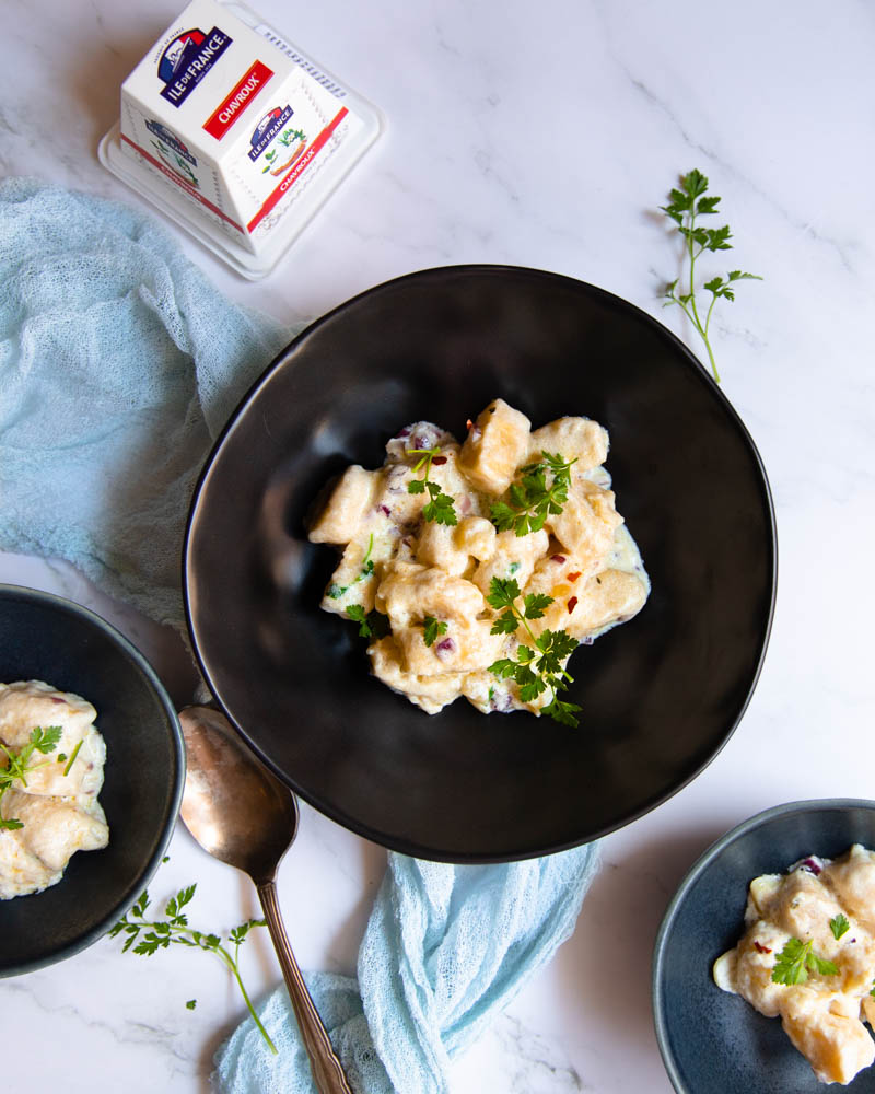 Aceste paste mici din cartofi, cu sau fără ou și făină se fac ușor, rapid și se mănâncă imediat după ce le pregătești. Seamănă cu găluștele noastre cu prune, având la bază aceleași ingrediente. Doar că în acest caz după ce le fierbem le învelim în sosuri simple sărate, cu unt , arome, legume, sau în sosuri cremoase cu smântână, roșii sau cum am făcut eu astăzi în sos cremos din brânză.
