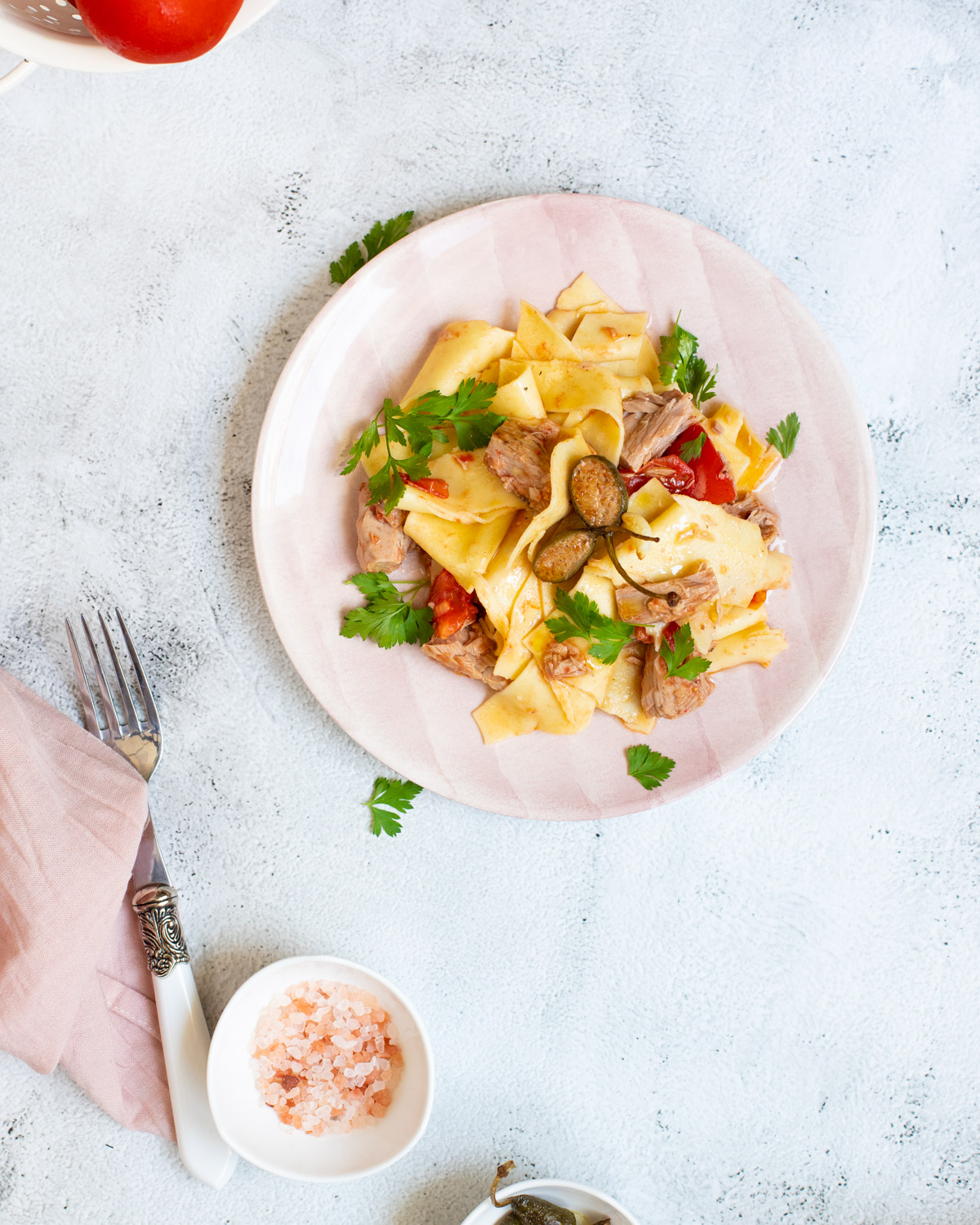 Am spus paste pentru că nu vreau să fiu foarte strictă în alegerea tipului de paste folosite. Dacă îți plac spaghetele alege spaghete, dacă vrei orice altă formă de paste ești liber să o alegi. Eu o să-ți spun că am folosit niște foi de lasagna. Rămase în cămară de ceva vreme, acum au ajuns în rețeta potrivită. Paste groase, rupte după cum au dorit ele, neregulat, au fost ca un burete pentru sosul de roșii cu ton. Mi-a plăcut și aspectul dar și gustul.