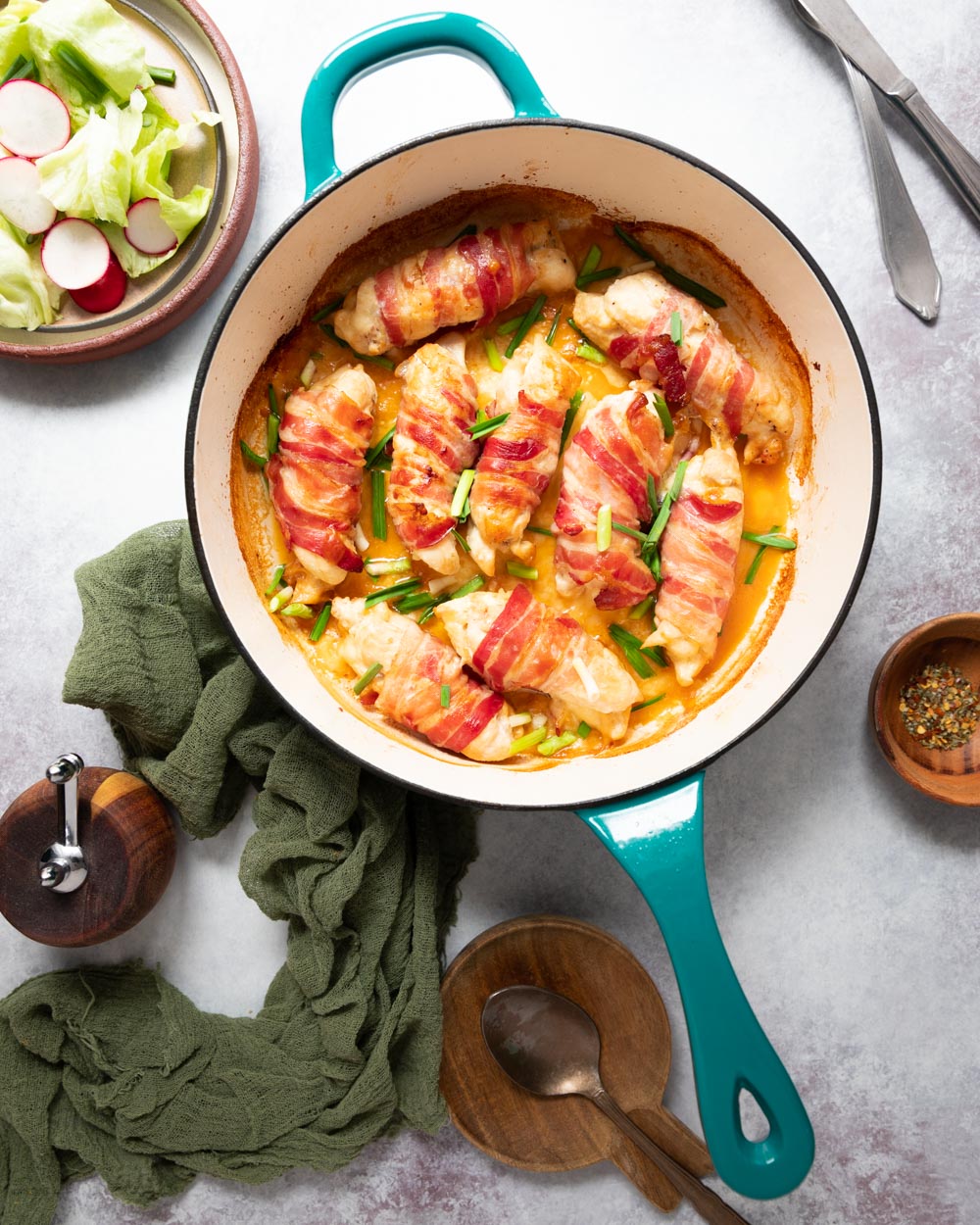 Sau un mod drăgut de a face banalul piept de pui delicios. Umplut cu bastonașe de cașcaval afumat, învelit în felii subțiri de bacon, făcut rulouri mici, devine o friptură super bună, aromată. Îți mai trebuie doar o porție mare de salată, deci multe legume fresh și ai făcut o masă yummy.