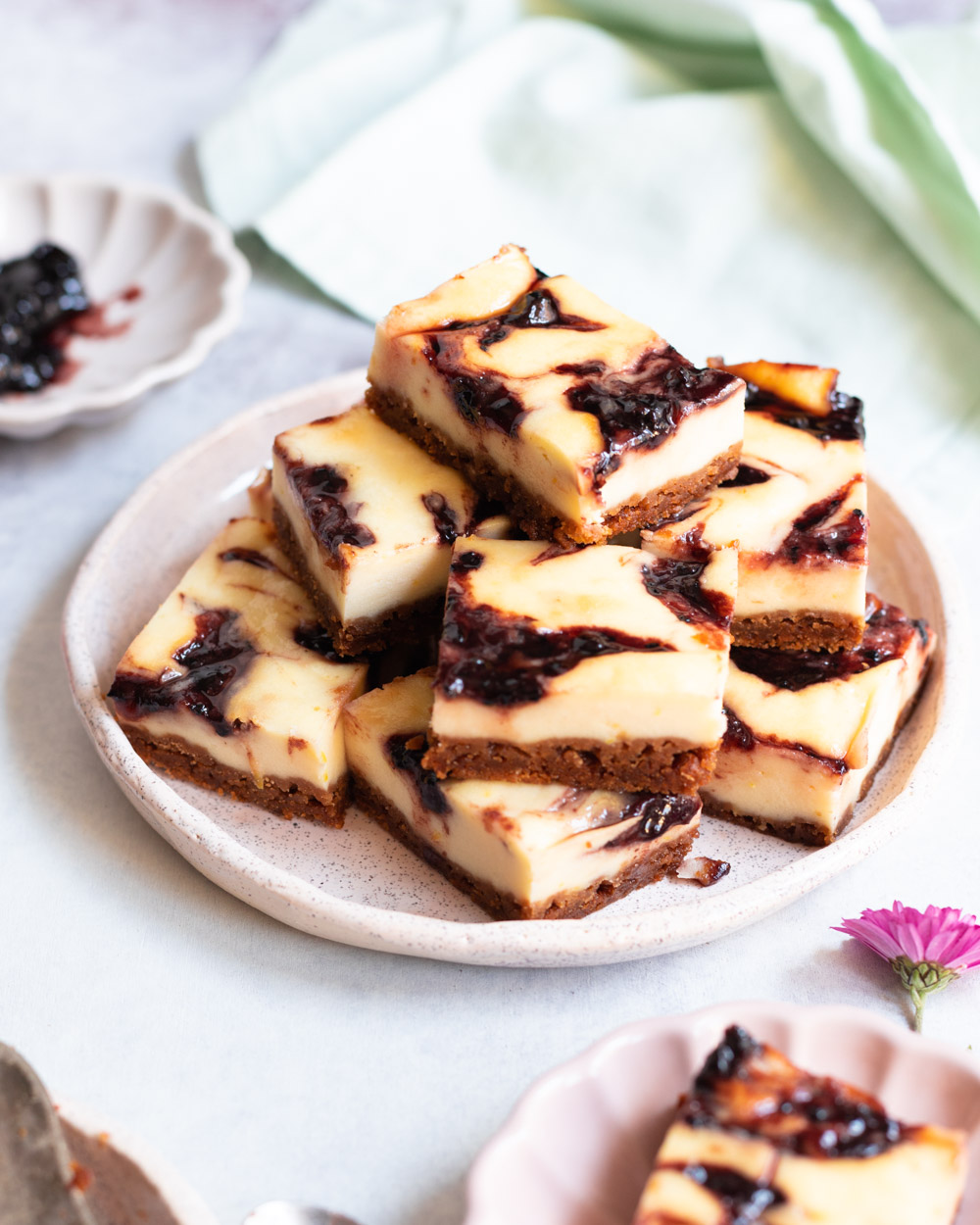 Iti plac deserturile cu crema de branza? Dar cu blat rapid din biscuiti? Ei bine, chiar asta am facut eu aici. O prajitura cu crema de branza si gem de coacaze. O prajitura pe care o poti taia in forma de batoane si sa o servesti alaturi de o cafea buna sau pentru dulcele din pachetelul de scoala.