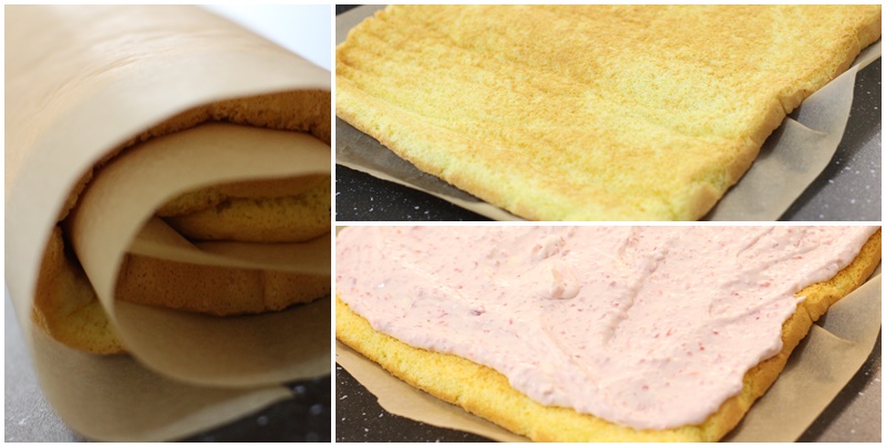 ASAMBLAREA DESERTULUI (varianta 2): Toacă mărunt căpșunele și lasă-le puțin la scurs într-o sită. Desfaci foaia de ruladă, întinzi crema, adaugi căpșunele tăiate și rulezi ușor desertul. VEZI și 'TIPS' de mai sus!