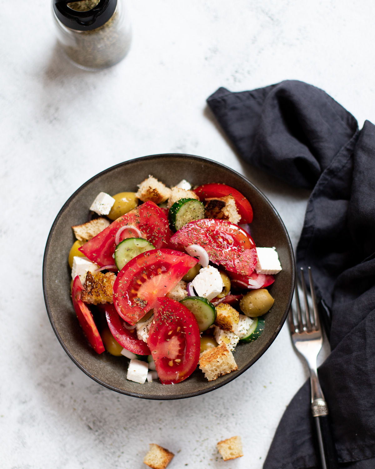 Astăzi am improvizat puțin. Am fost inspirată de Prăjiturela și de salata ei de roșii cu pâine, panzanella. Așa că am adăugat câteva crutoane în salata mea grecească. Iar brânza feta a fost de fapt brânză telemea de oaie.