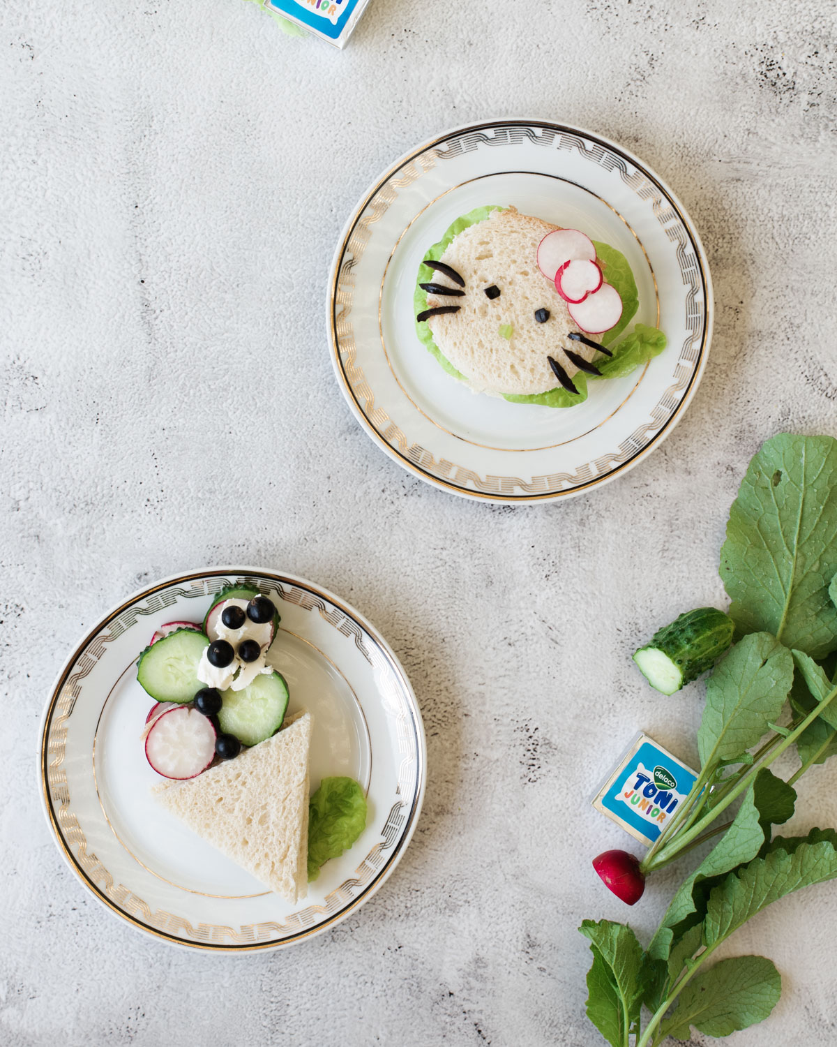 Pentru Hello Kitty: Am tăiat 2 felii de pâine rotunde (cu o formă rotundă de prăjitură sau un pahar). Am uns feliile de pâine cu cremă de brânză Delaco Junior și am adăugat câteva felii de salată verde în interiorul sandvișului. Deasupra am decorat cu felii de ridichi și măsline tăiate în formă de ochișori și mustăți.