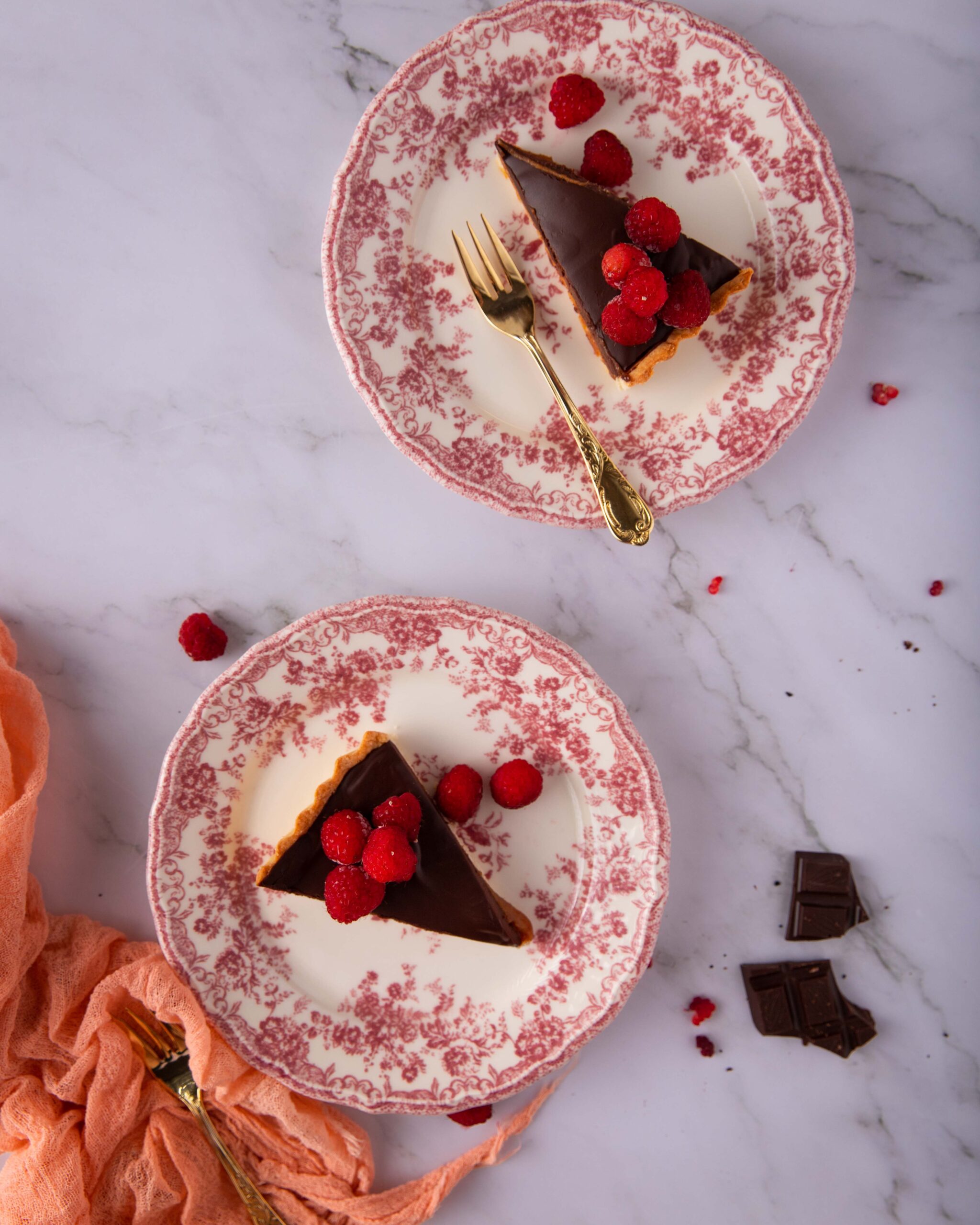 Crema de ciocolată se face cel mai ușor. Nu trebuie decât să torni peste ciocolata bucăți (la temperatura camerei) smântâna pentru frișcă fierbinte. Amestecă ușor până când se topește toată ciocolata. Toarnă imediat peste tartă și stratul de ciocolată.