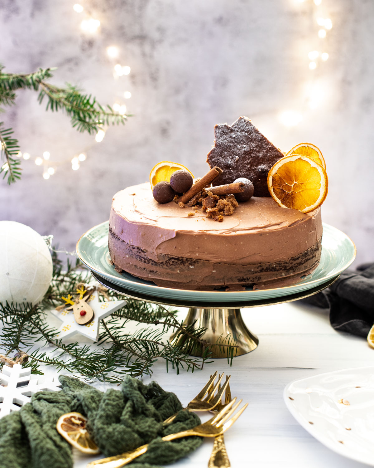 Desertul nostru pentru masa de Crăciun este un tort cu aromă de turtă dulce. Blat cu unt, miere și condimente pentru turtă dulce: scorțișoară și ghimbir pudră. Crema cu mult unt, cremă de brânză și ciocolată neagră este perfectă pentru blatul aromat.
