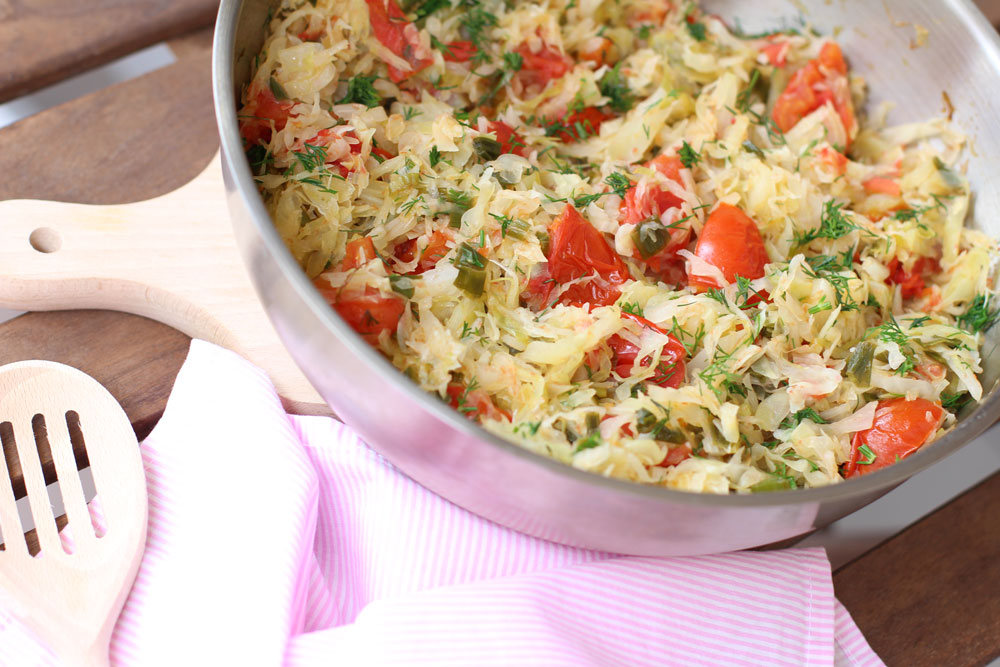 Tigaie rapida cu doar trei ingrediente: varza dulce, rosii proaspete si ceapa verde.
