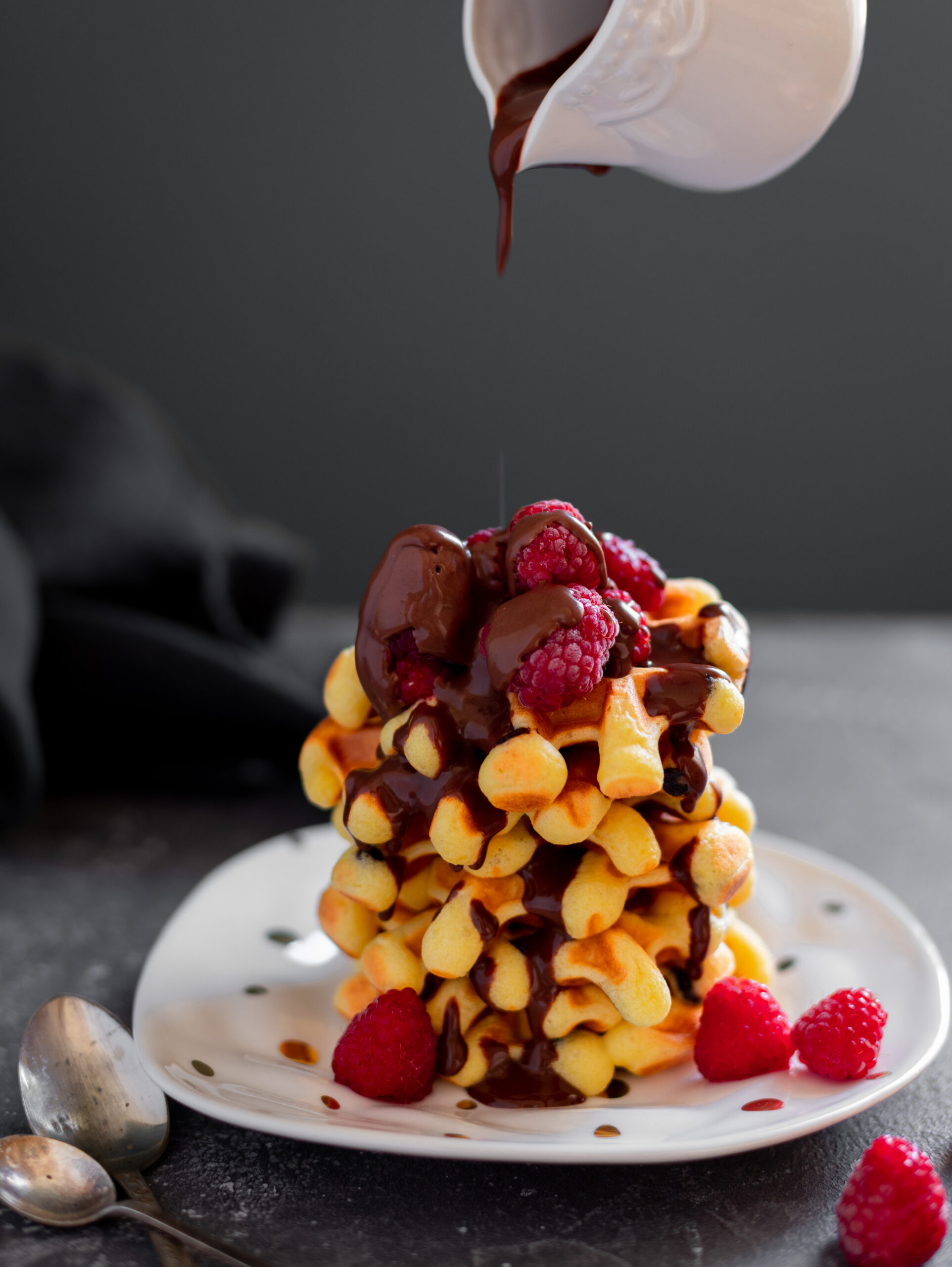 Așa începe o zi bună, cu waffles învelite în sos de ciocolată și cu multe fructe proaspete. 🙂